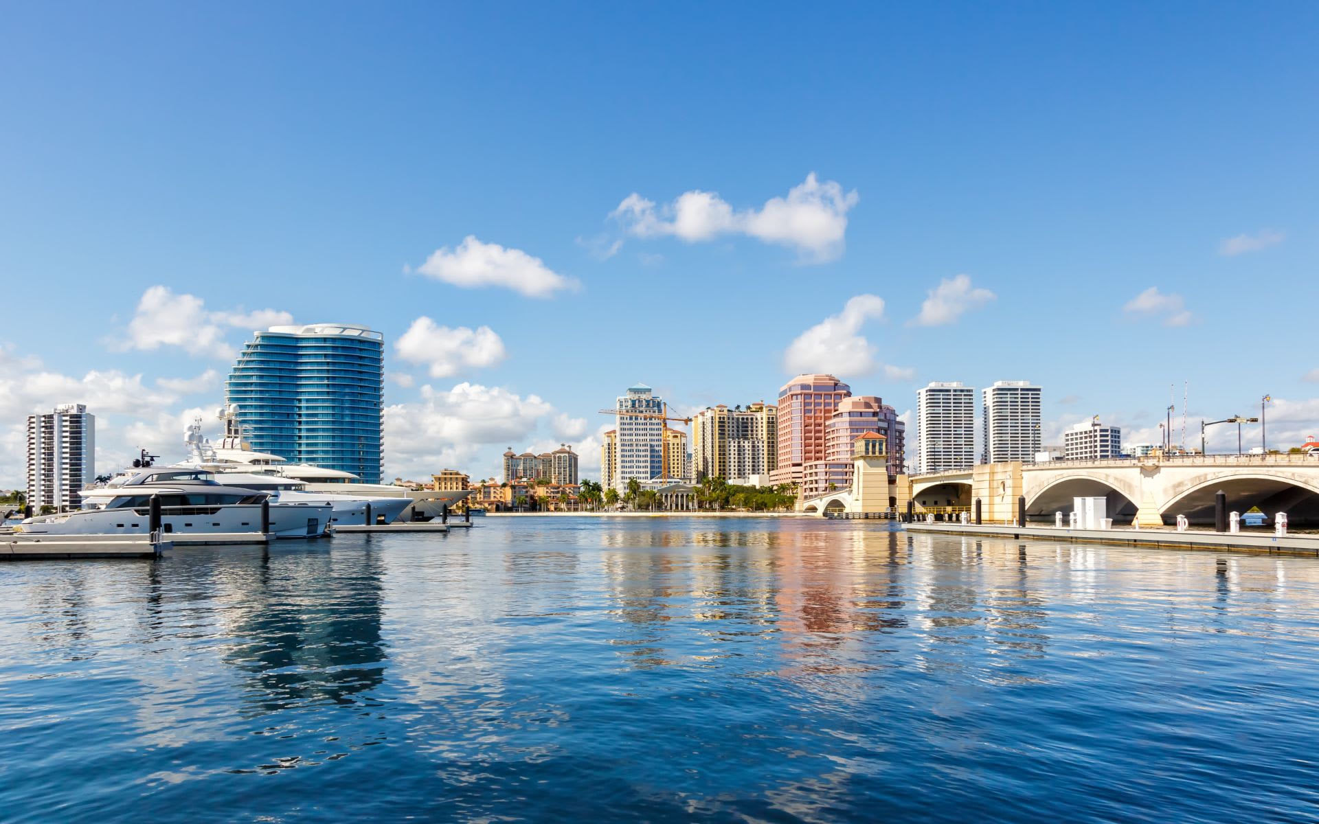 West Palm Beach waterfront skyline showing new urban condo buildings and Intracoastal waterway during the day.