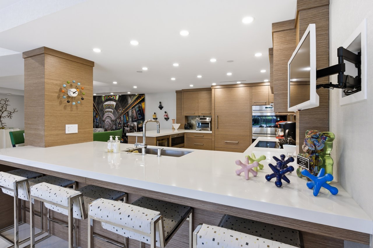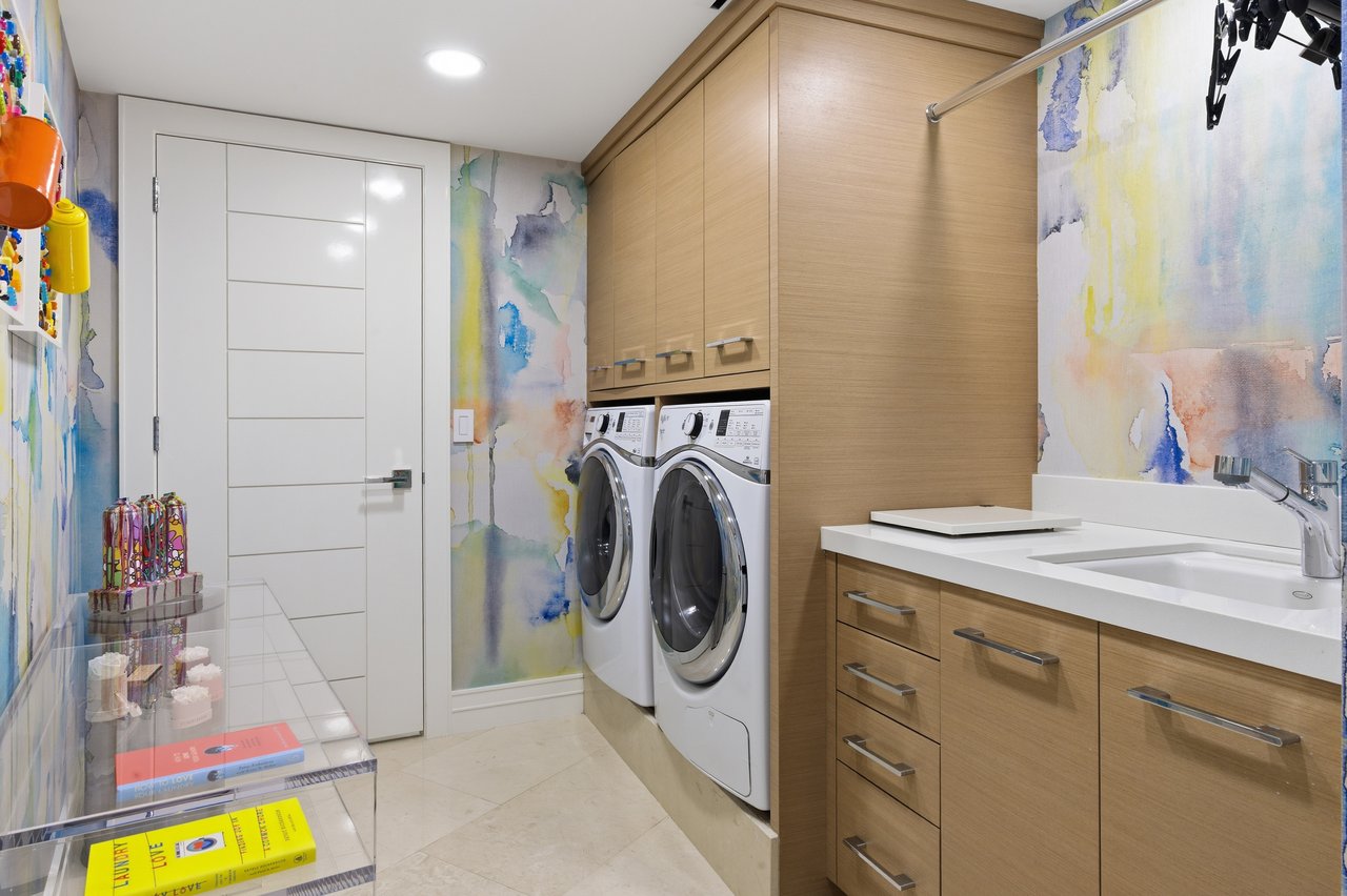 Extensive custom millwork and built-ins provide exceptional storage while maintaining clean architectural lines. Modern comforts include integrated smart home technology, Lutron lighting, Somfy motorized shades, hurricane-impact glass doors, and a separate laundry room.